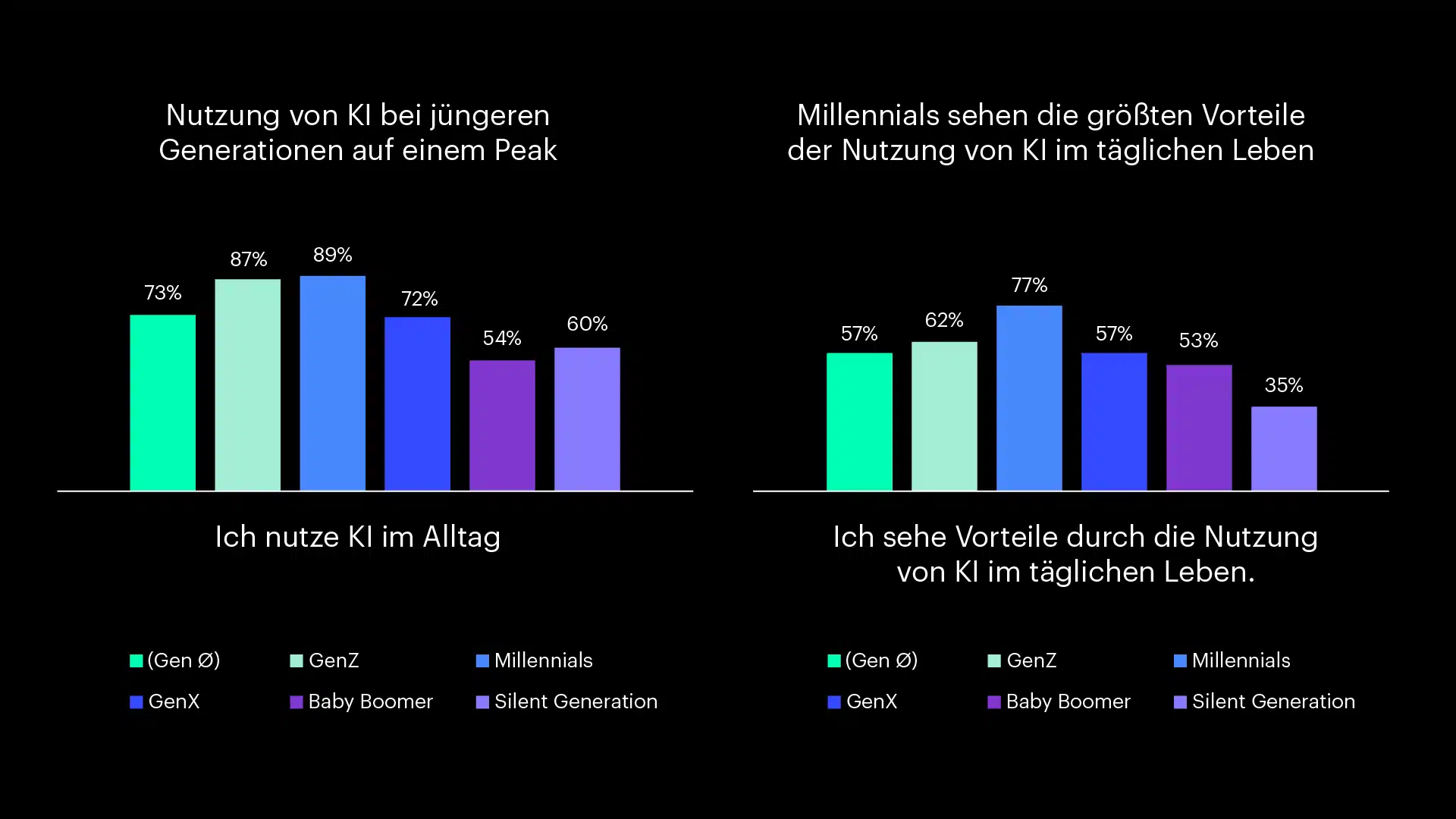 Noch krasser die Ergebnisse bei der Projektionsfrage für die Zukunft. Mit 73% Zustimmung blicken die Millennials in eine rosarote KI-Zukunft. Und hier sind GenX und Baby Boomer noch deutlich optimistischer als die ganz Jungen. Nicht einmal jeder Zweite aus der GenZ (46%) steht der weiteren Verbreitung der KI positiv gegenüber. Hier zeigt sich konsequent bestätigt, was sich auch in anderen generationsspezifischen Befragungen zeigt. Das Pendel schwingt zurück: Mit der GenZ ist nach den Millennials eine Generation herangewachsen, die in vielen Werte-, Einstellungs- und Verhaltensfragen nicht eine Fortsetzung, sondern geradezu das Gegenteil ihrer Vor-Generation denkt und tut.